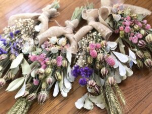 庭で摘んだフレッシュハーブを輪ゴムでしっかりと束ね、その上からお気に入りのリボンや麻紐で輪ゴムを隠すように結びましょう。あらかじめ束ねる部分の葉は取り除いておくとまとめやすく、仕上がりもきれいになりますよ!レモンユーカリや、ローズマリー、タイムなどのお好みのハーブと装飾用にドライになってもきれいな花や実を混ぜてもおしゃれです。玄関や窓辺に吊下げたり、テーブルコーディネートに取り入れてもステキですね。