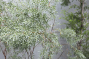先ほど紹介した「メラレウカ」の近縁種で同じフトモモ科の「レプトスペルマム」。園芸店でギョリュウバイという名前で売られているのを見られた方もいるかもしれません。ウメに似た小さな花を付けるところからギョリュウバイと呼ばれているようです。その中でも細い銀葉が美しいのが「レプトスペルマム シルバティーツリー」です。常緑樹で、あまり目立ちませんが初夏に白い花をたくさん咲かせてくれます。白っぽい銀葉と白花がとても爽やかな印象で、事例のように白っぽいコンクリートの壁の前などに植えるとほどよいドライ感が演出できますよ。