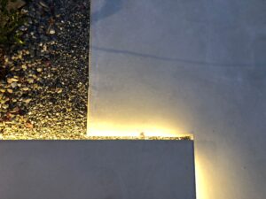 セットしたタイマーにより、日が沈みかけた夕暮れ時に照明が一斉に点灯。エクステリア工事で設置した照明は階段下のLEDバーライトと、表札を魅力的に照らすスポットライトの2か所のみ。最小の照明で最大の効果が得られるエクステリア空間になっています。