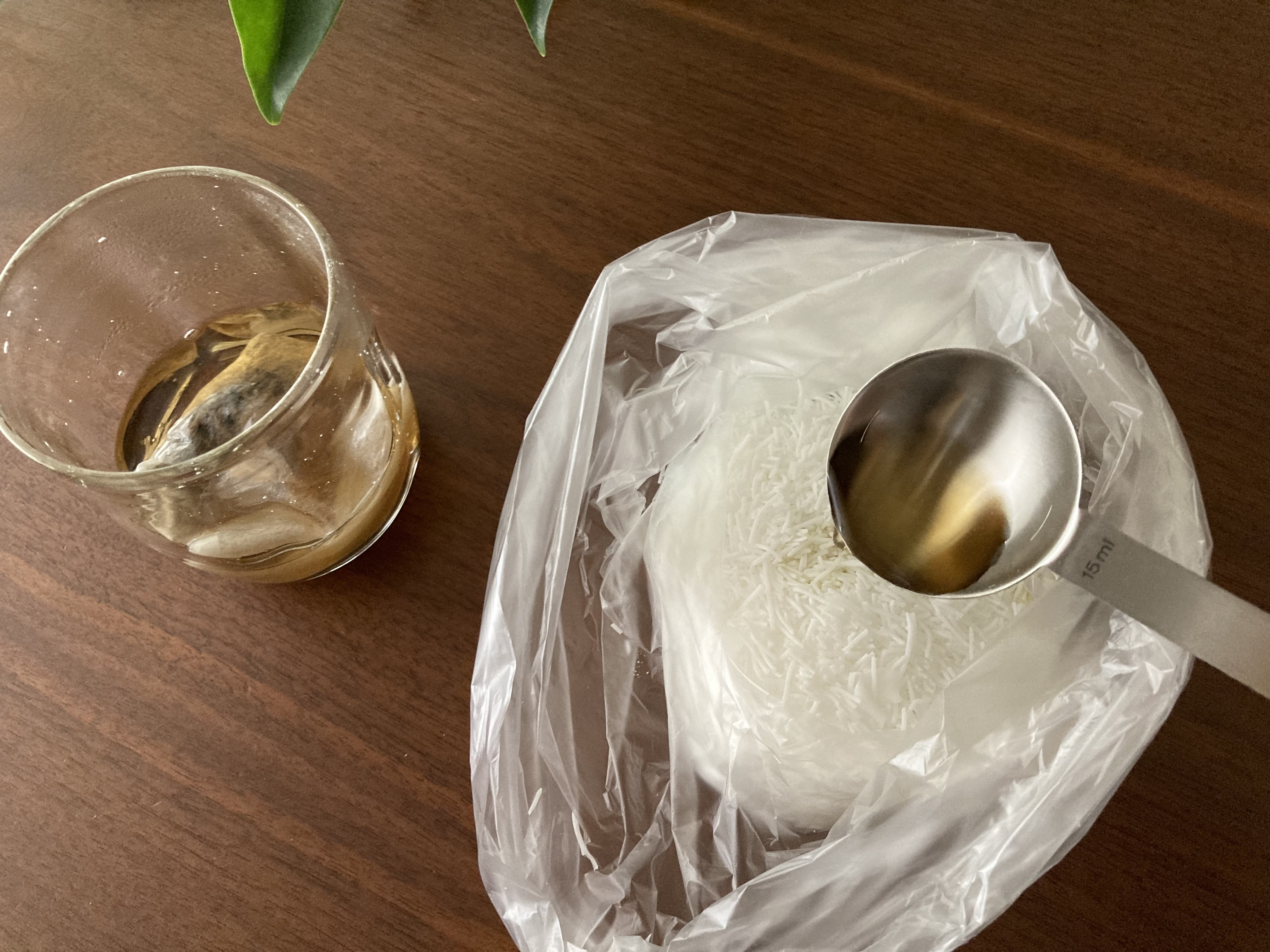 ハーブの抽出液大さじ2杯を3回に分けてチャック付きビニール袋に入れた石けん素地に加えてよくこねます。