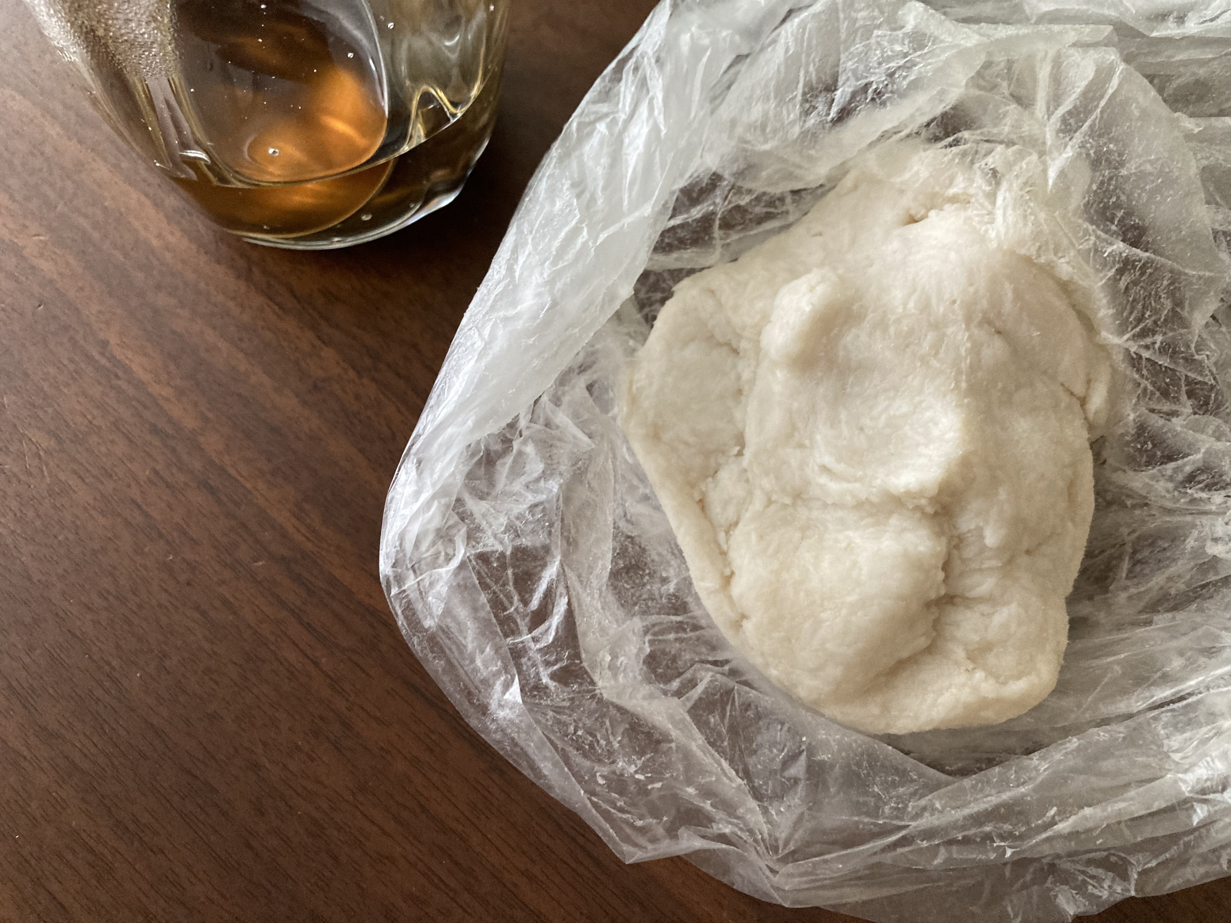 全体がしっかりと混ぜ合わさったら、はちみつ小さじ1杯を少しずつ加えてさらにこねます。この時に石けん素地がボロボロとまとまらないようなら、抽出液を少量ずつ追加し、全体が耳たぶくらいの硬さになるまでこねましょう。