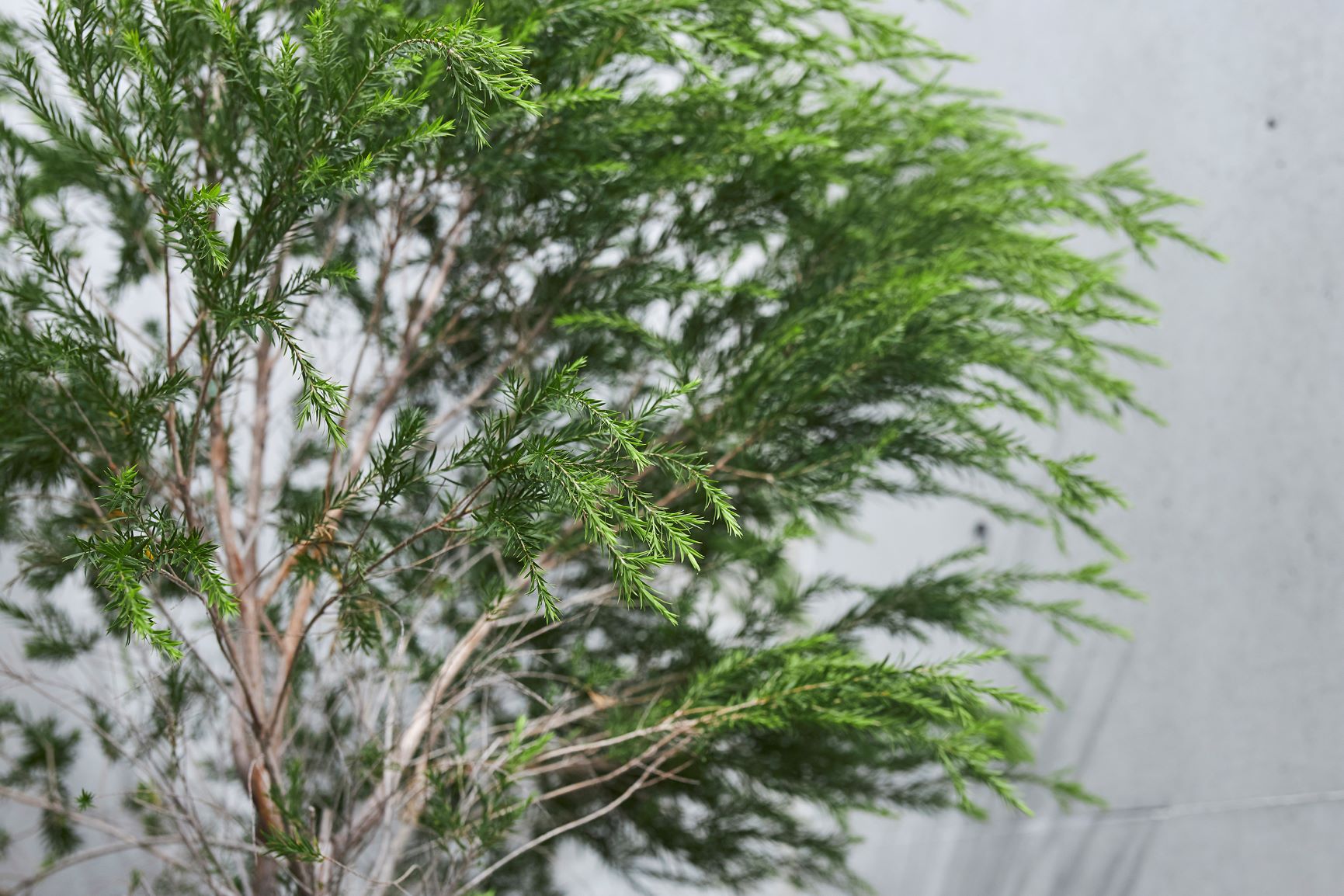 その繊細な葉姿が涼し気な『メラレウカ・ブラックティーツリー』。見た目が大人しく比較的、日本の外構やお庭に取り入れやすい植木です。常緑樹でありながら細くて繊細な葉と可愛らしい花を咲かせてくれるので様々なシーンに活躍させることができますよ。