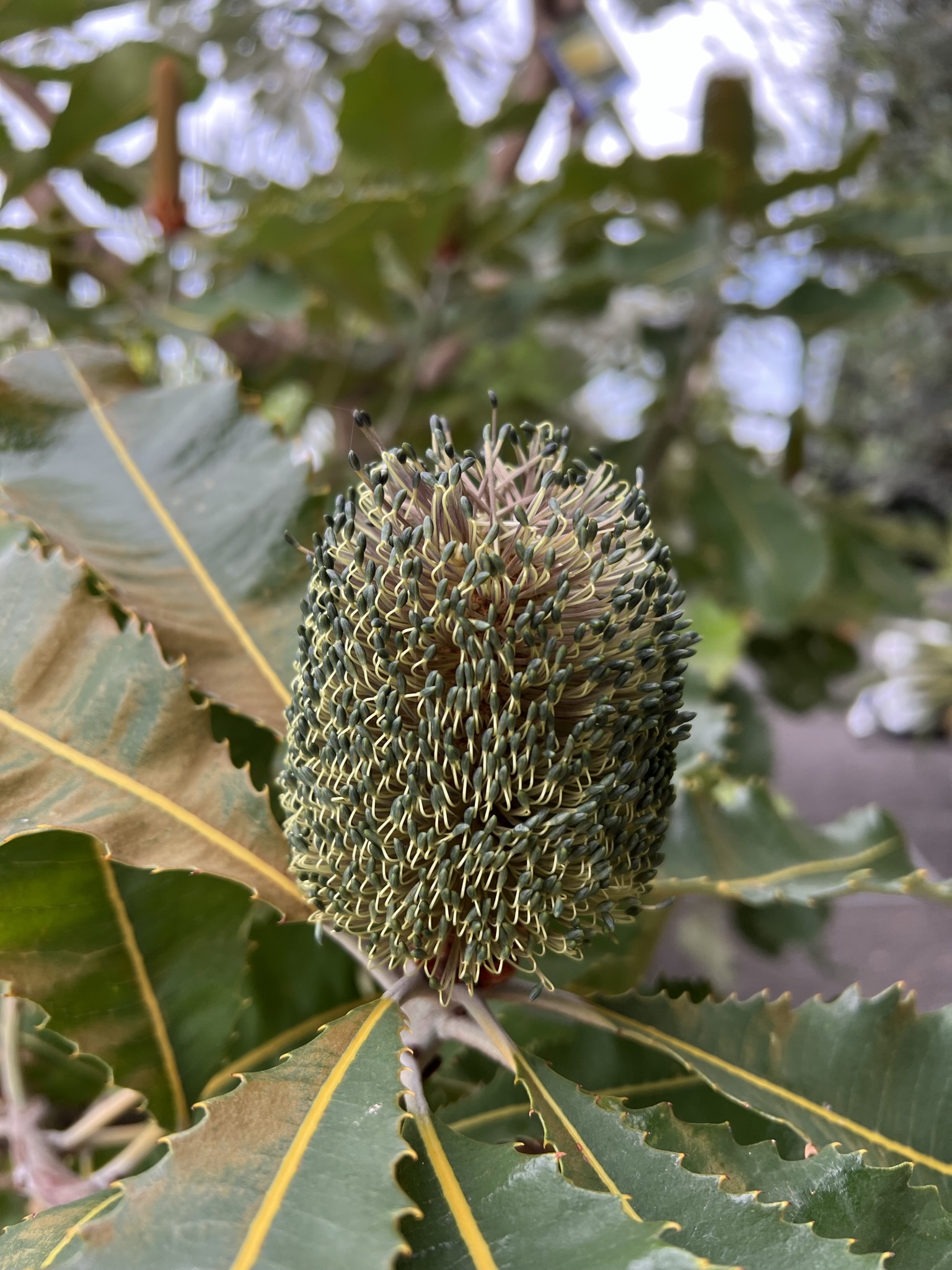 バンクシアで楽しみなのがお花。このバンクシア・スワンプのお花は色が特徴的。咲き初めは鮮やかなグリーン、満開になるとクリーム色、花が終わると茶色くまるでタワシのように変化するんです。ただし、ある程度株が充実してこないと花を咲かせてくれないんですよね。花を咲かせるまでは気長に待ってあげてくださいね。