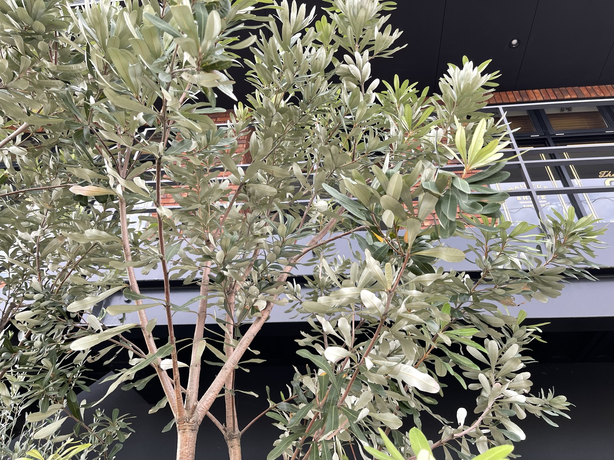 写真を見ていただくと2本のバンクシア・コーストが植わっているのが分かると思います。同じ品種でも高さや個体が変わると見た目の雰囲気が変わりますよね。統一感を持たせつつバラエティー感を出す為に、同じ品種で高さ違いを植えるのもおススメですよ。