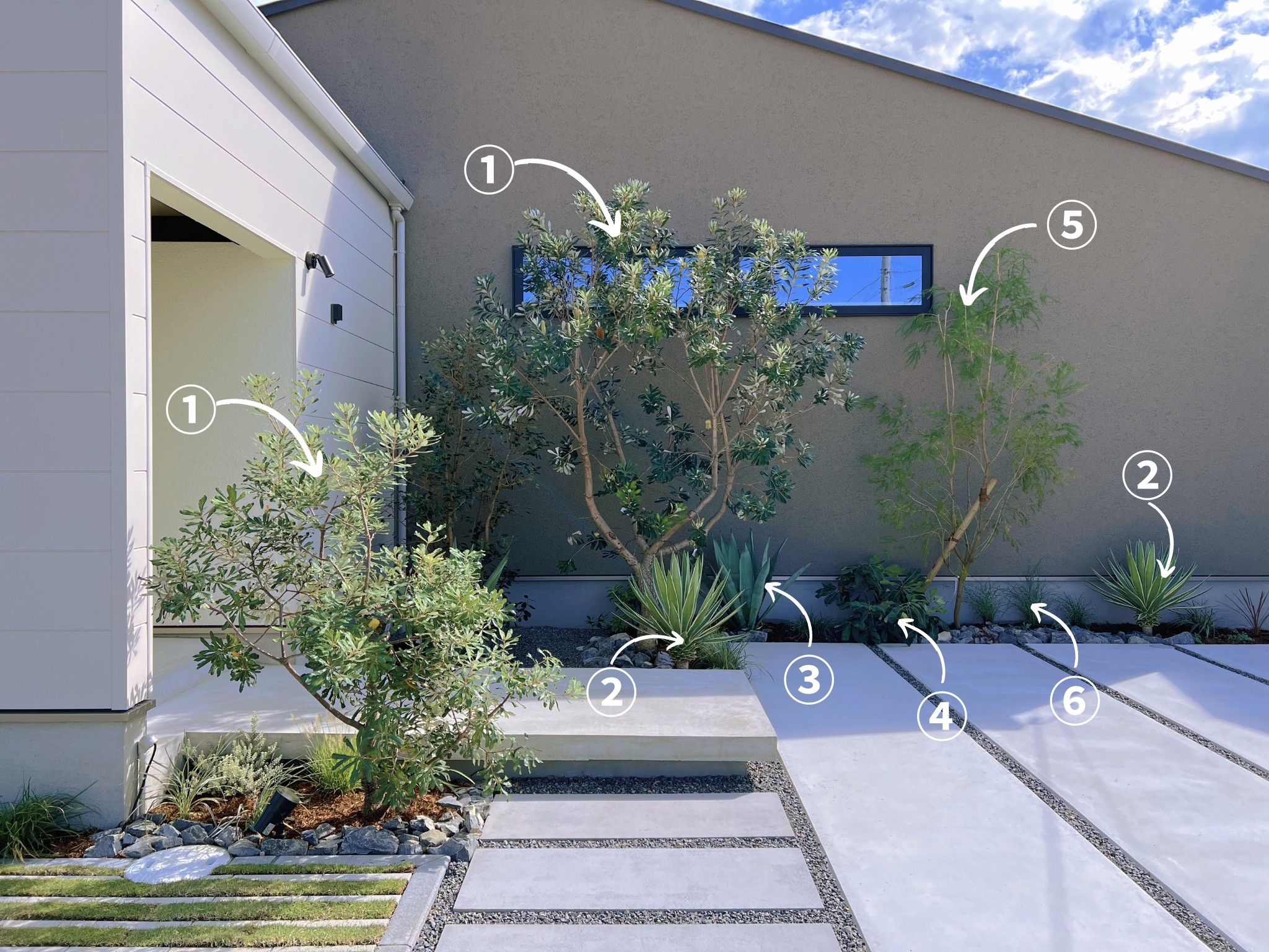 いずれも日本で地植え可能な上に常緑樹ですので様々な場面で重宝されています。日本の植木ではあまり見ないような葉っぱの形や少しくすんだような色合いもオシャレに見える要因かもしれません。