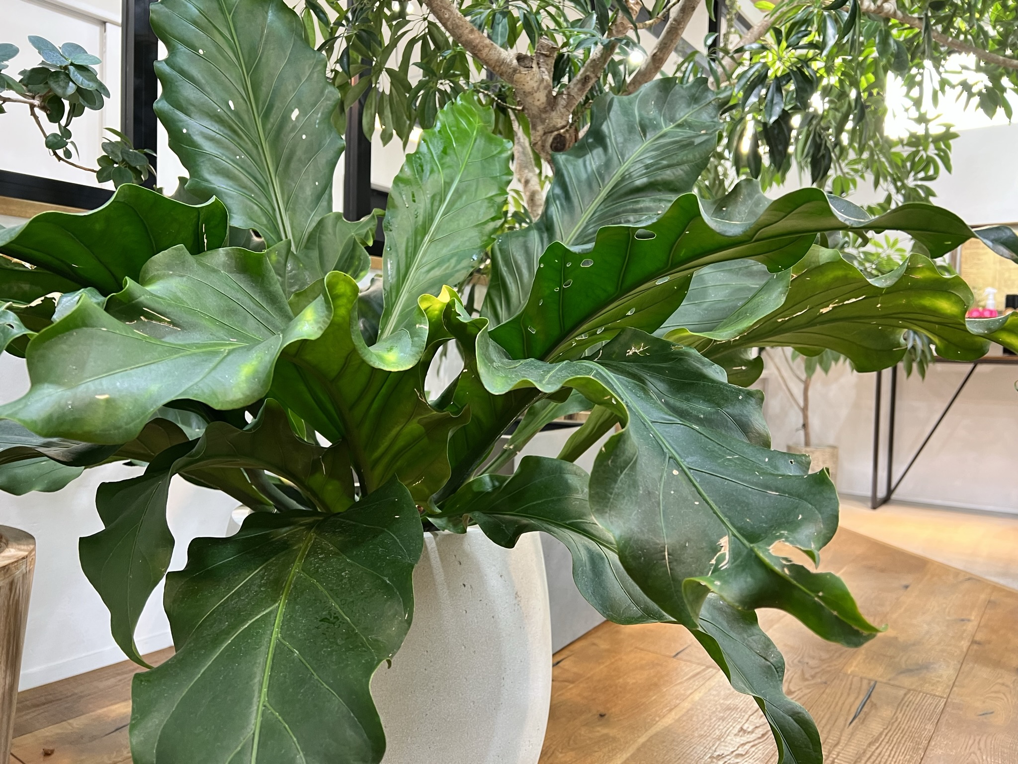 原種系のアンスリウムの一種で、花ではなく葉っぱを楽しむ観葉植物。濃い緑の葉が美しく、最近のおしゃれなインテリアショップなんかには必ずと言って良いほど飾られていますよ。