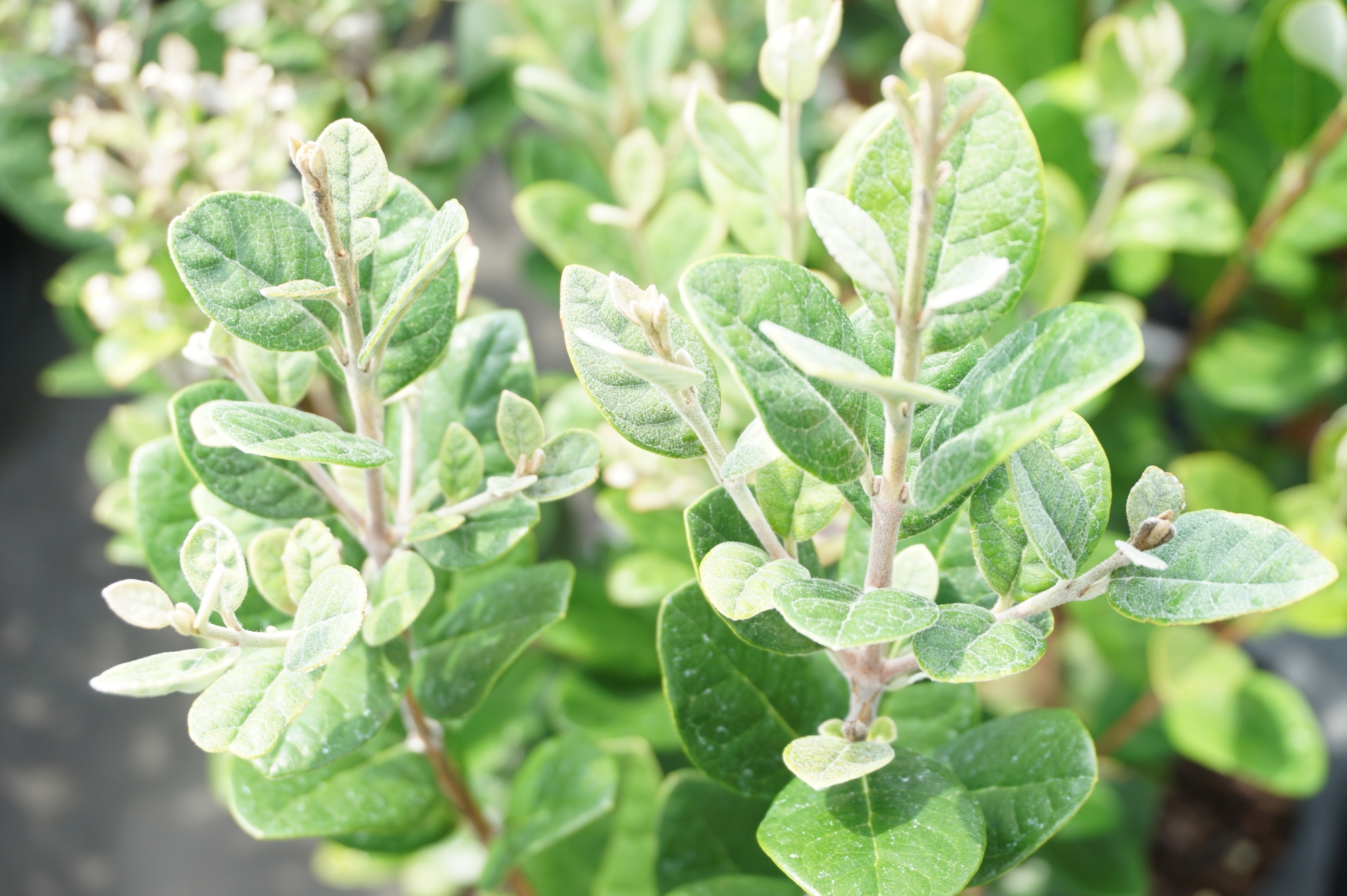 表面がきれいなグリーンで裏側には白い産毛が生えていて、遠くから眺めると白銀色にキラキラと輝くように見えてとってもキレイなんですよね。常緑樹で、花も咲いて果実が生食できるとなれば人気が出る理由も分かりますよね。