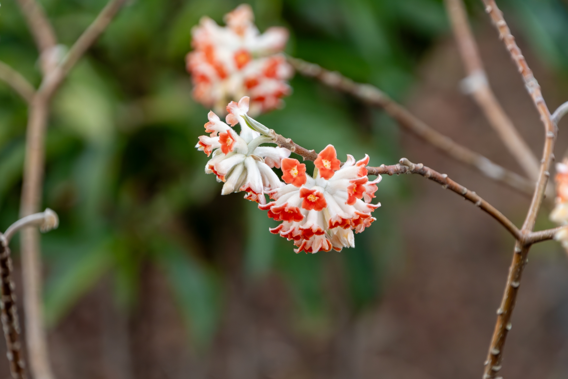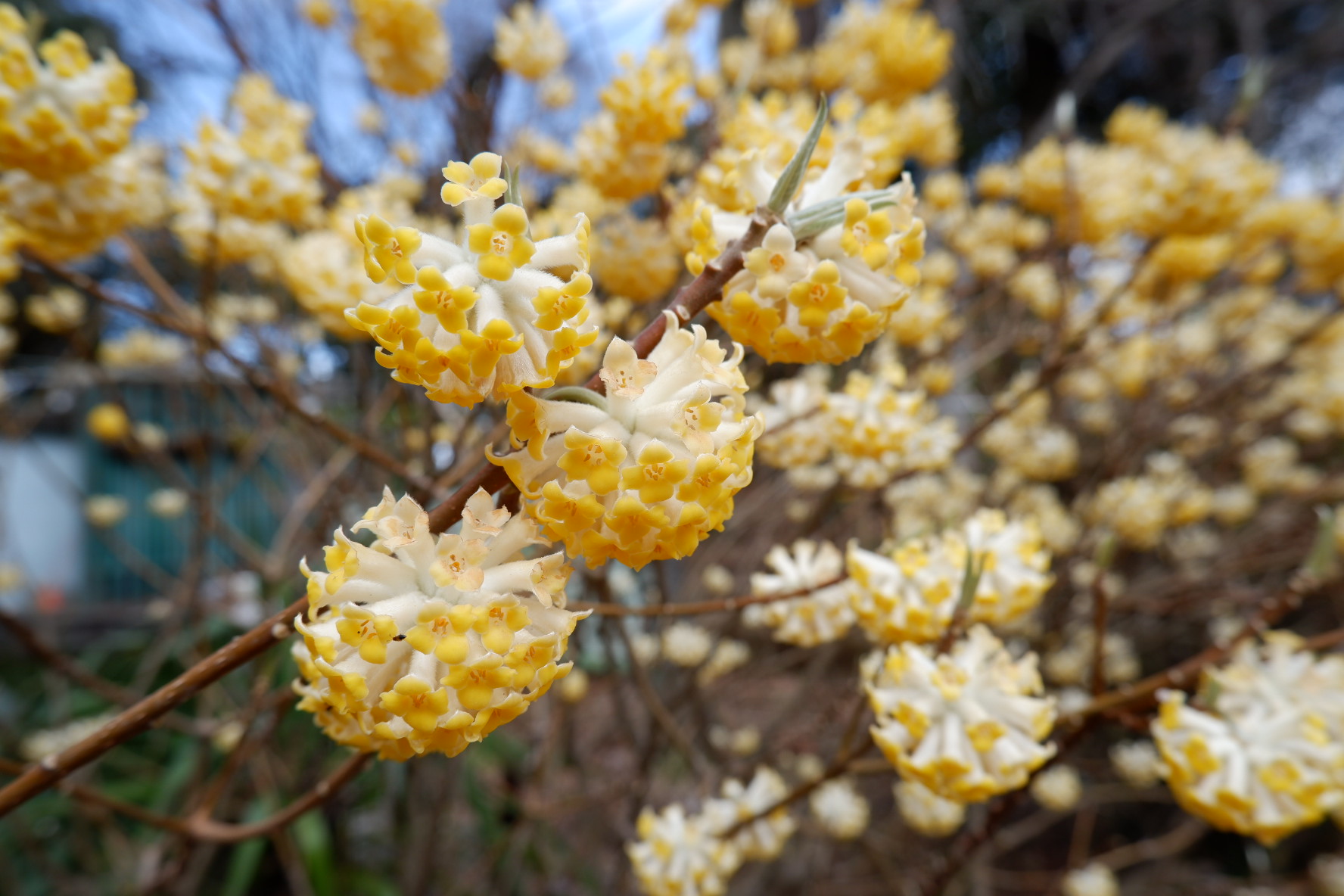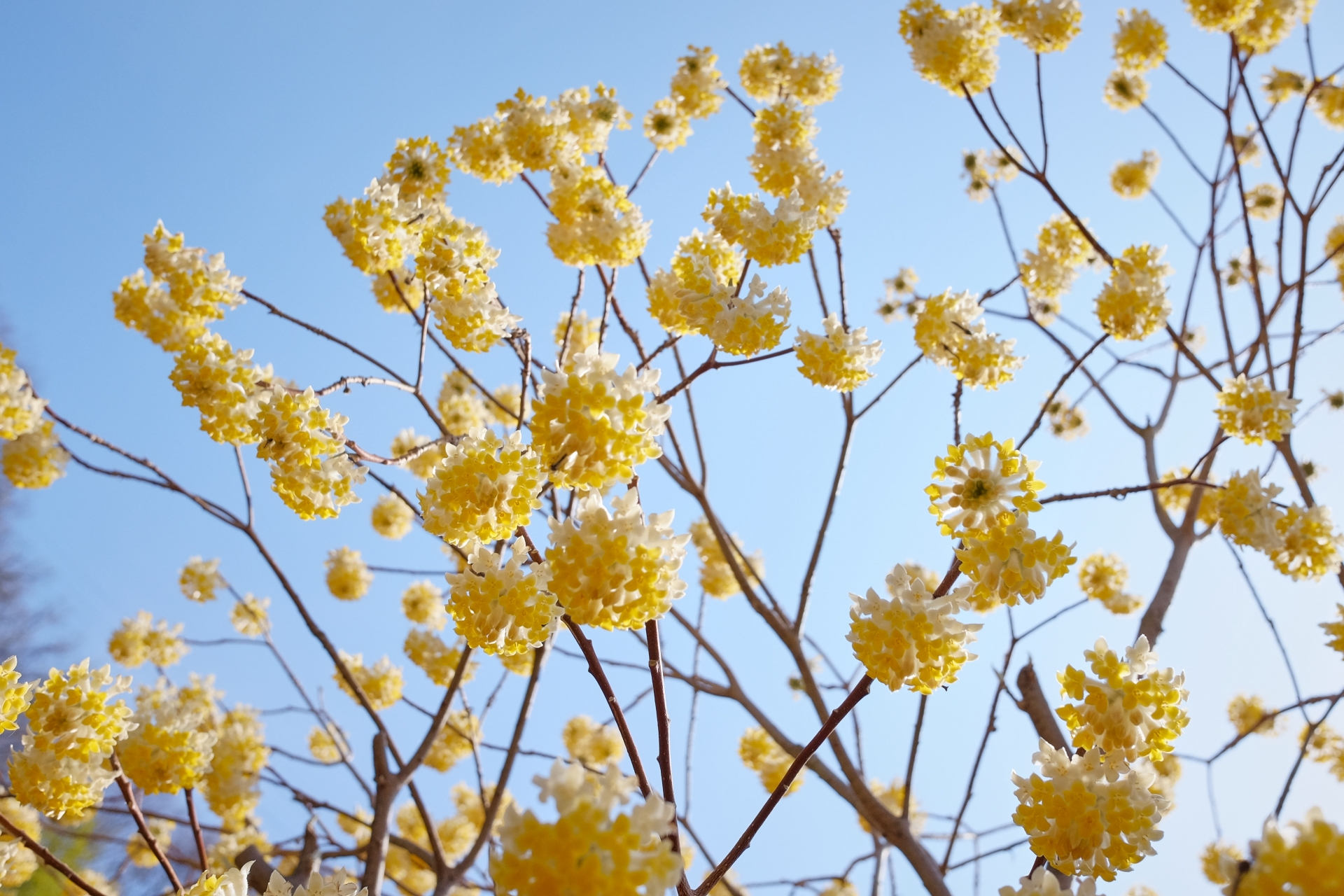 ミツマタの最大の魅力は、葉が出る前に花を咲かせることによって生まれる枝と花のコントラストです。