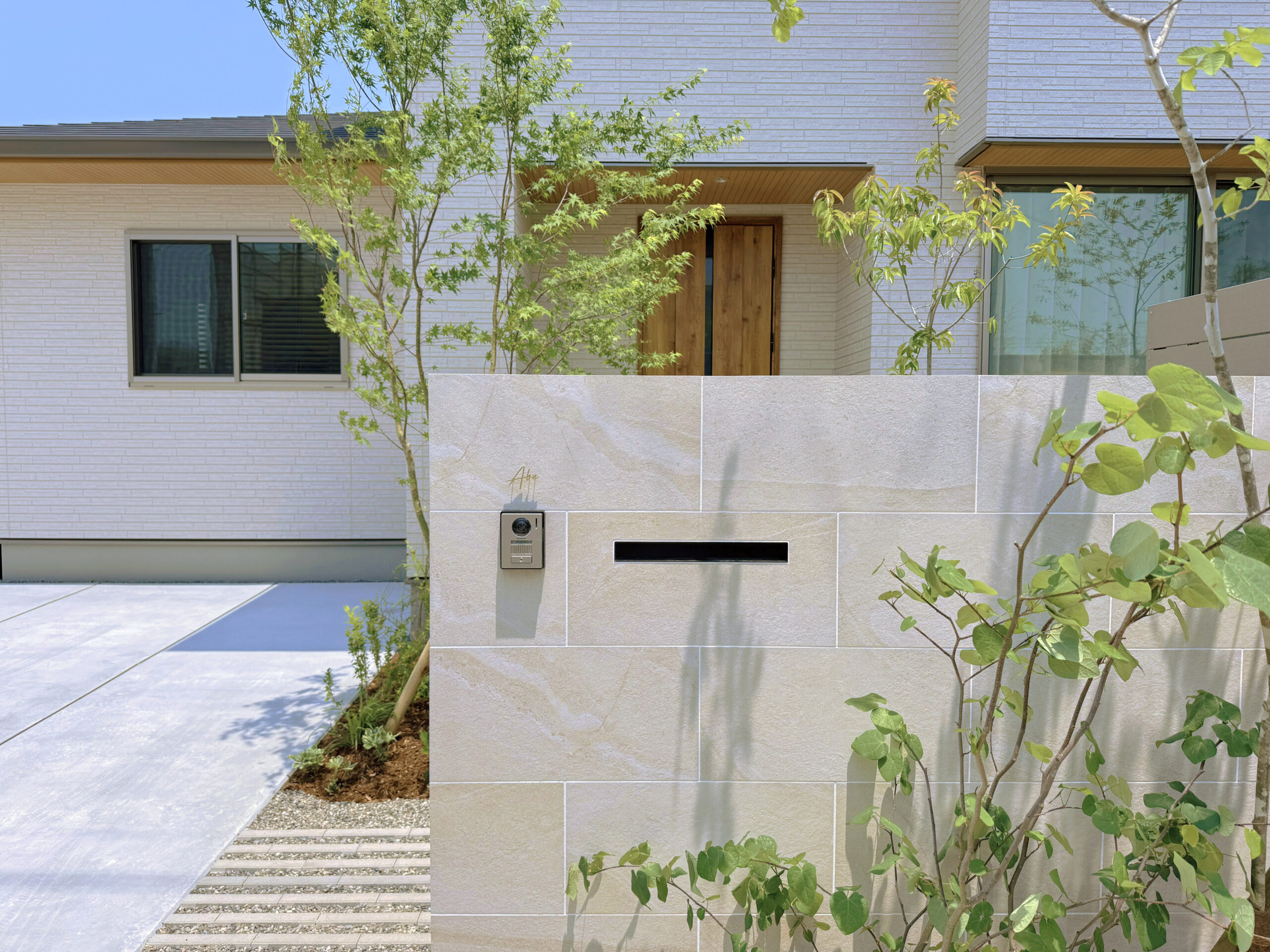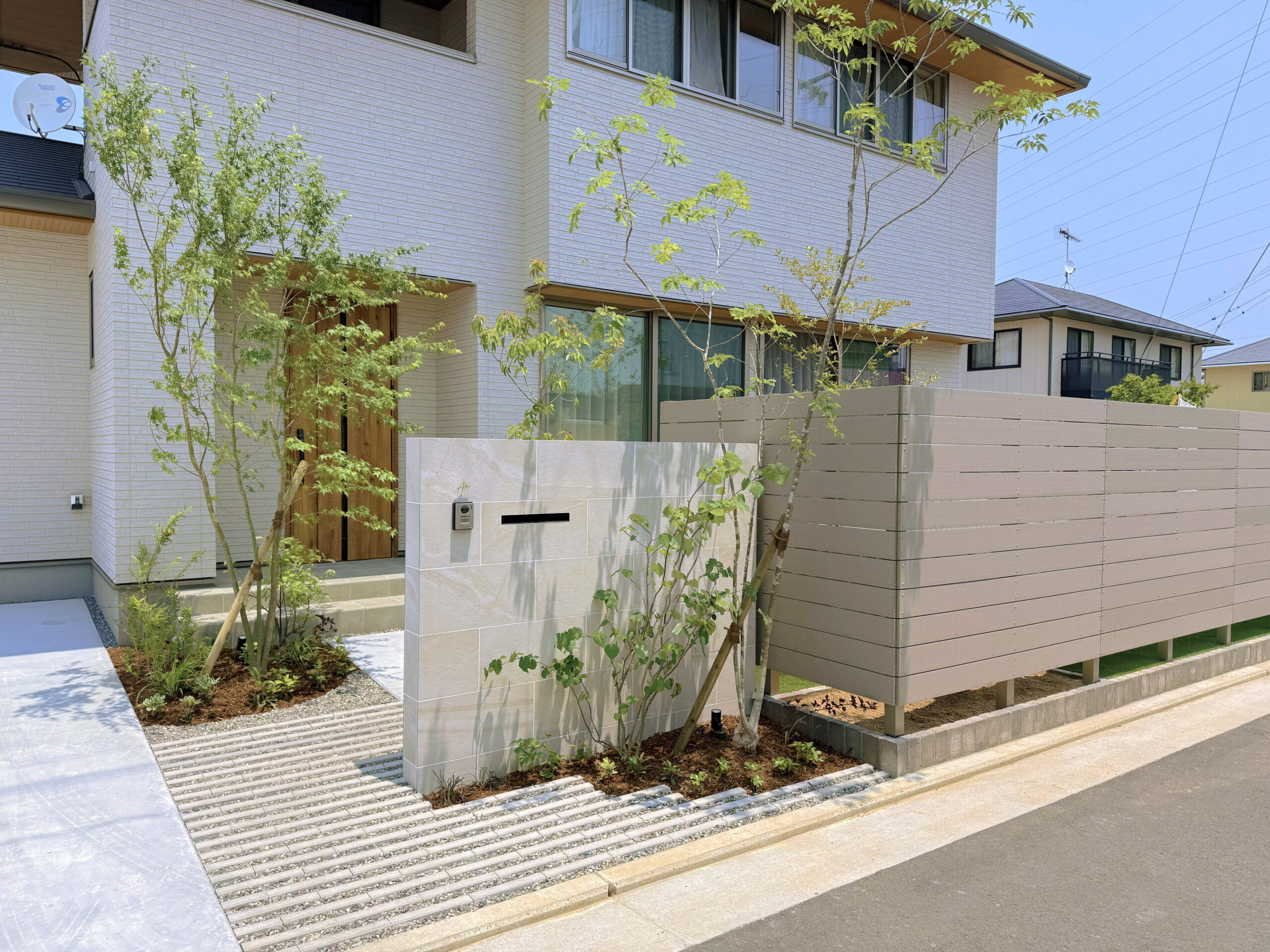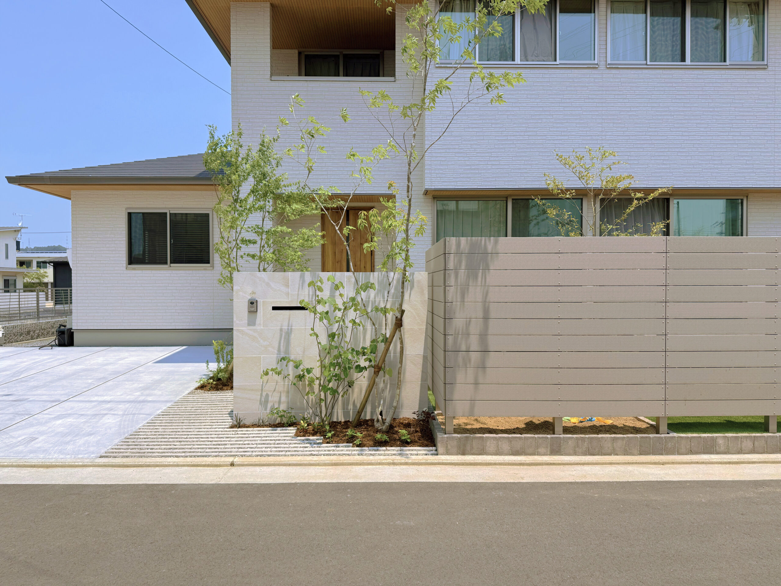 石調の淡いグレーのタイルやグレージュのフェンス。