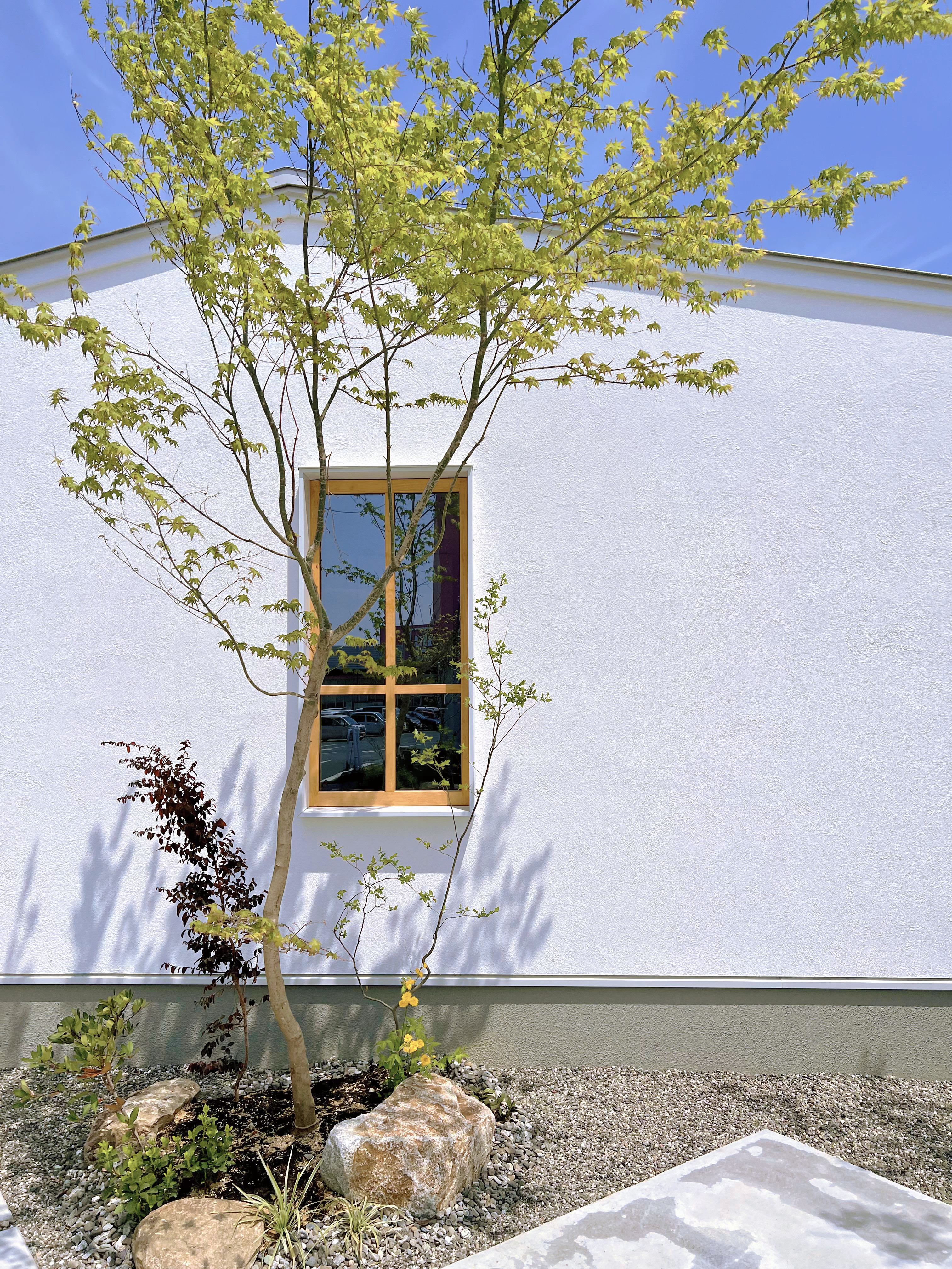縁取りが印象的な小窓の前には、『モミジ』と『オトコヨウゾメ』を。