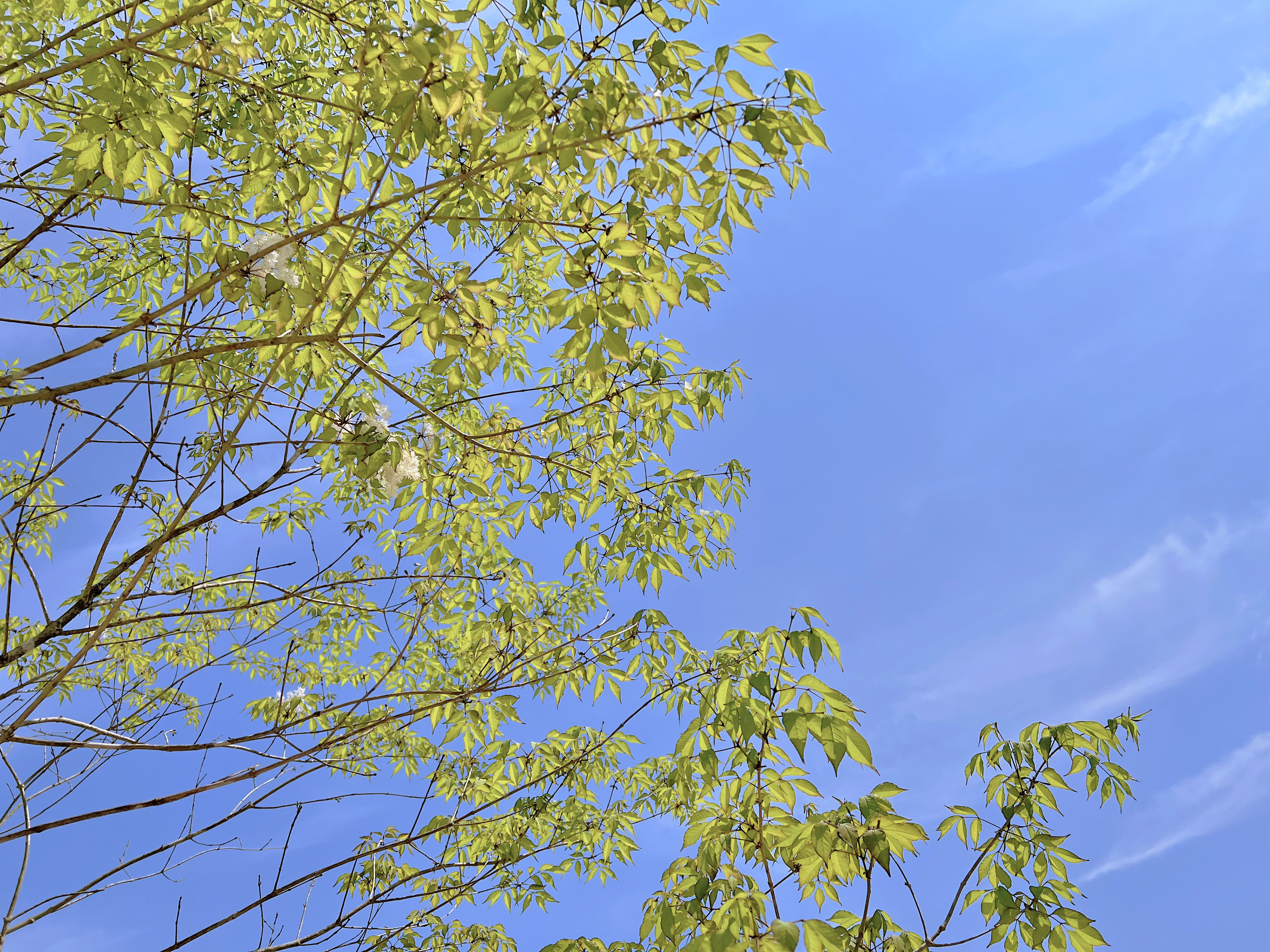 キレイに吹き始めた樹々の新芽にくらべて、芝生の色付きがもう少し。