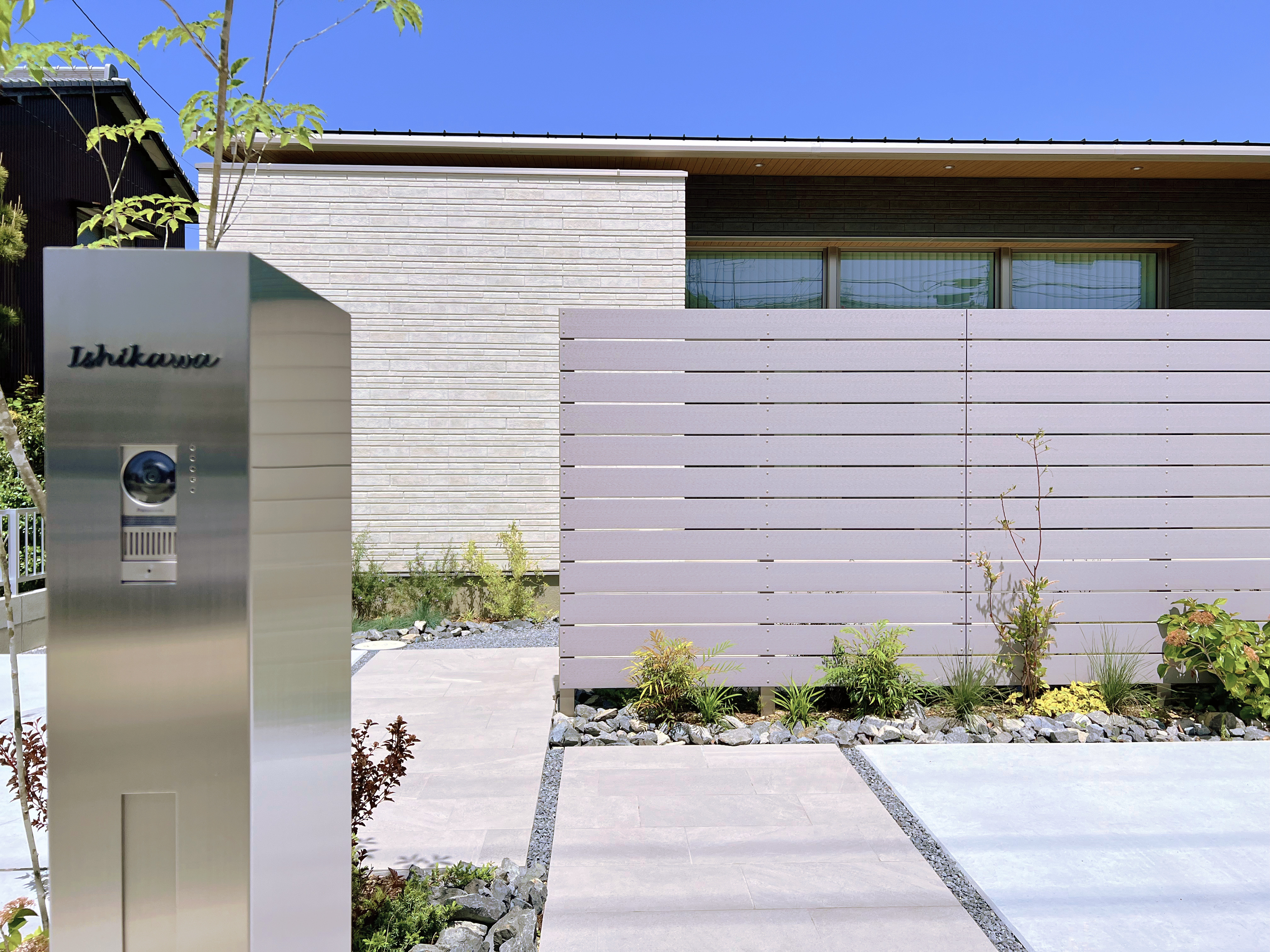 前面道路からの視線を意識したアプローチと目隠しフェンス。